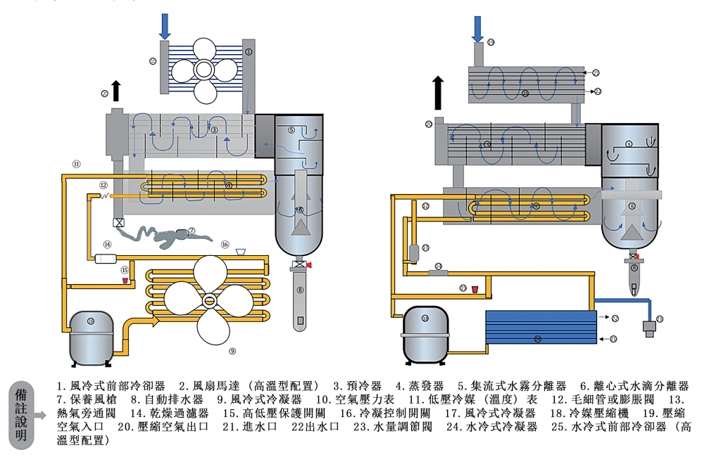 冷凍式乾燥機制冷劑喺製冷壓縮機18內增壓後,經冷凝器9或24冷卻,喺經12轉化為低溫液體進蒸發器4吸收壓縮空氣中嘅熱量後氣化,經氣液分離器後進製冷壓縮機循環壓縮。