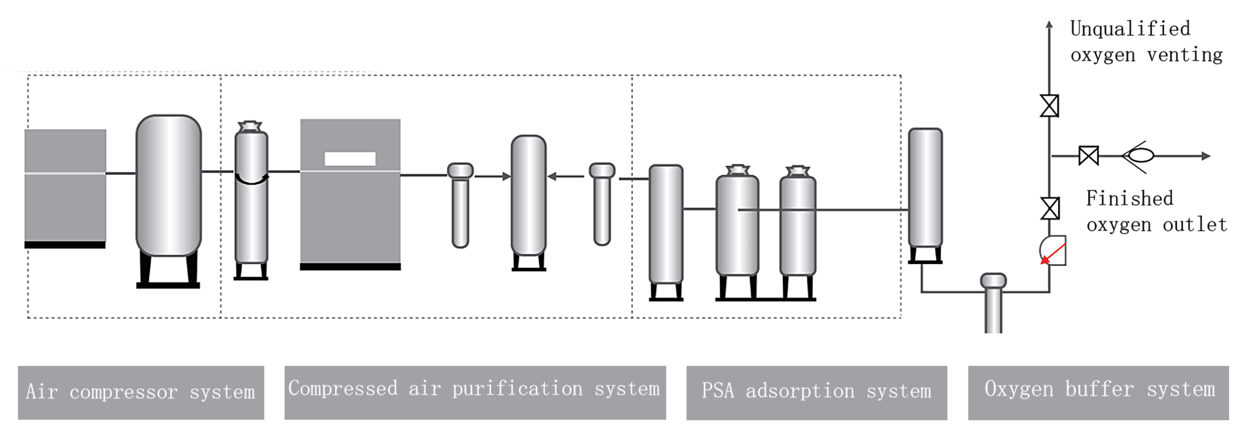 The core part of the oxygen generator is the PSA adsorption system, which consists of an air process storage tank, adsorption tower, pneumatic valve, PLC controller, and compression device. The compressed and purified gas passes through the oxygen-generating molecular sieve of the adsorption tower to separate the produced oxygen. The dual-tower structure One tower adsorption oxygen production, one tower desorption regeneration, combined with PLC controlled cycle alternating two towers, produces high quality oxygen.