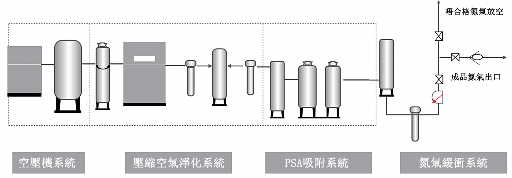 PSA 吸附系統包括空氣工藝儲罐、吸附塔、氣動閥門、PLC 控制器、壓緊裝置等組成。吸附系統係制氮裝置嘅核心部分,其主體係兩個裝滿碳分子篩嘅吸附塔。當潔淨壓縮空氣進入其中一個吸附塔時,O₂、CO₂ 同微量 H₂O 會被碳分子篩吸附,氮氣就從出口端輸出成為產品氮氣。當一塔進行吸附制氮時,另一塔透過減壓,將吸附喺分子篩微孔中嘅 O₂、CO₂ 同 H₂O 排出,實現分子篩再生脫附。兩塔交替進行吸附同再生,可以連續穩定輸出氮氣。