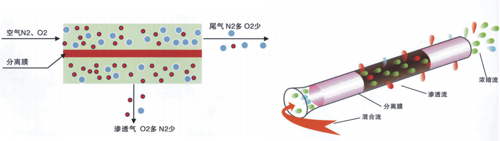 膜分离制氮机技术是根据空气中的氮气和氧气在膜两侧压差作用下,在膜中的溶解度和扩散系数不同而实现分离的,渗透率快的水蒸汽、氧气等一些气体先透过膜,成为富氧体,而渗透率较慢的氮气则滞留富集,成为干燥的富氮气体,达到氧氮分离的目的。
