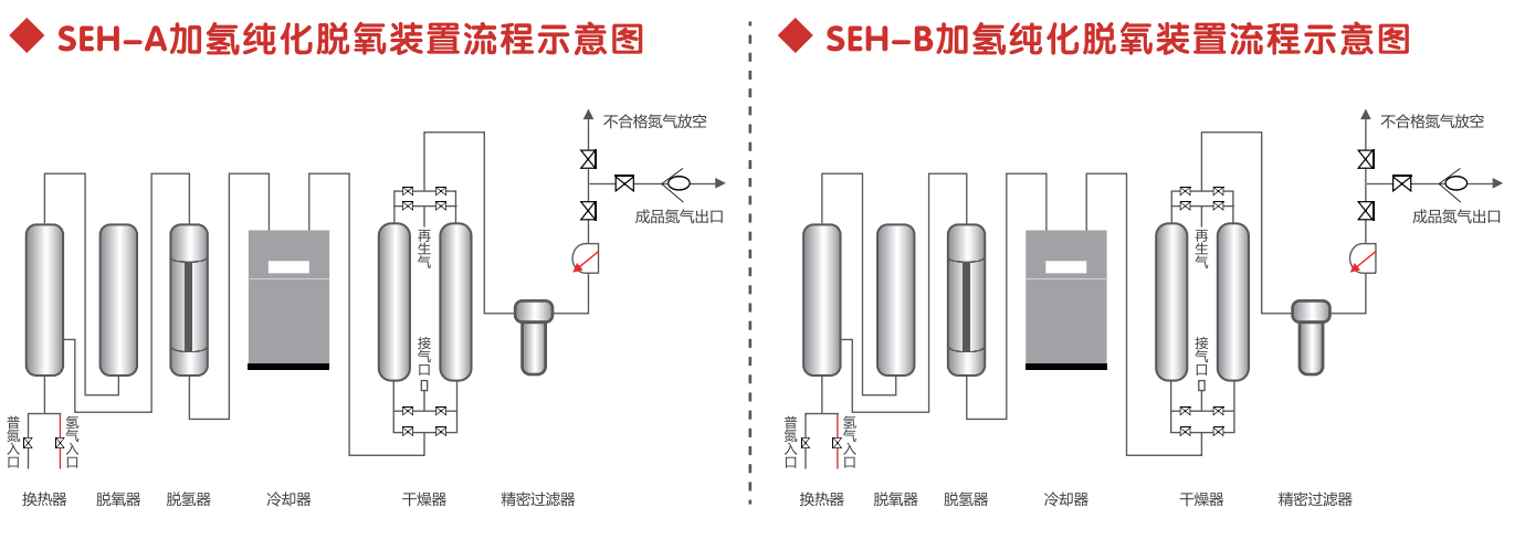 之后气体经滤水器去除生成水分,再进入脱氢器去除过量氢气;如果工艺允许带少量氢气,可略过这一步。最后,氮气经冷冻式和吸附式干燥机双重除湿,得到干燥稳定的高纯氮气。