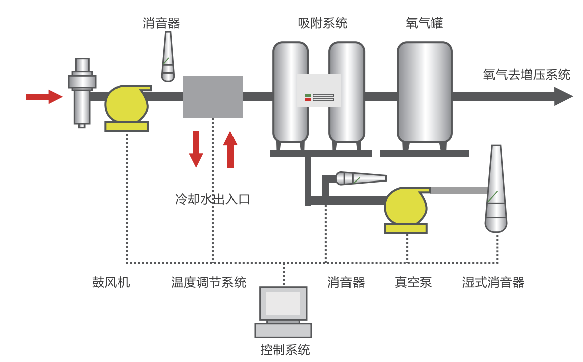 • 解吸:饱和沸石通过低于吸附压力的减压方式再生(即释放吸附的气体)。这是通过干式真空泵实现的。产生的废气排放到大气中。为了保持氧气供应的连续流动,安装了稳压罐,因此循环继续进行。